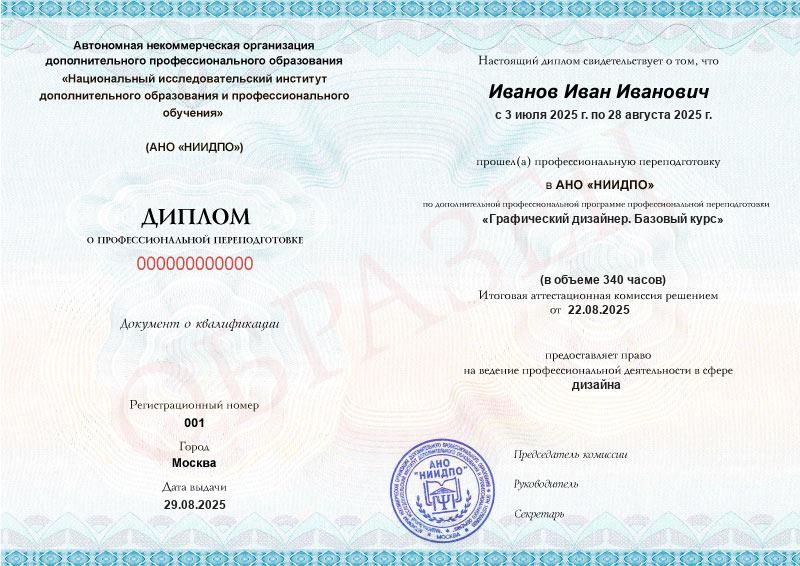 Да, документы оформляются на бланках с защитой от подделок, заполняются на русском языке, в них ставится печать АНО «НИИДПО».