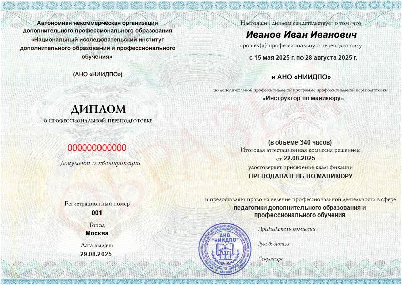 По окончании курса вы получите квалификацию «Преподаватель по маникюру» и диплом о профпереподготовке.