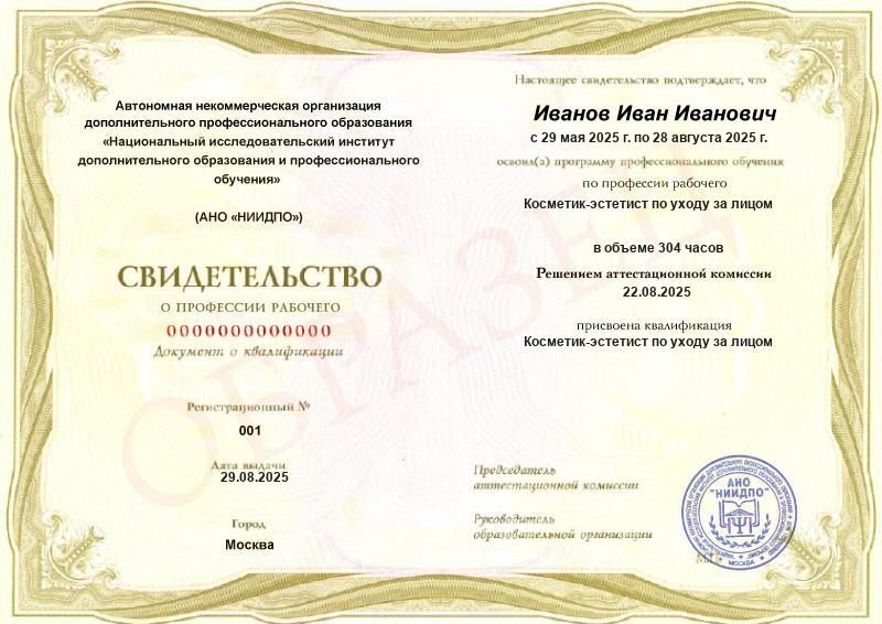 • Квалификация: Косметик-эстетист по уходу за лицом