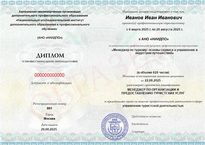 - Квалификация: Менеджер по организации и предоставлению туристских услуг