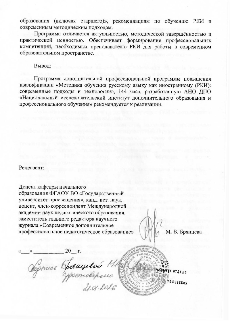 Выбрав эту образовательную организацию для повышения квалификации по направлению «Преподаватель РКИ», я осталась довольна. Материалы для обучения актуальны, интересны, подаются в удобной форме. На изучение каждого модуля отводится достаточно времени, что очень важно в условиях повышения квалификации без отрыва от работы. Единственное, что было не совсем удобно для меня - это прохождение итогового тестирования в определенные дни: или в вс (а это у меня единственный день, когда я не на работах, и который хотелось бы провести исключительно с семьей; но пришлось потерпеть и сделать в вс), или во вт (а это у меня рабочий день с 9:00 до 21:00), но т.к. времени достаточно - 2 ч, то решила итоговый тест в вс. Но понимаю, что под всех не подстроить систему! А в остальном - все замечательно! Дистанционное оформление договора, объяснение всех шагов по обучению, напоминание об итоговом тестировании и его особенностях. Спасибо! Теперь жду, когда Почтой России придет удостоверение! В дальнейшем, если потребуется еще пройти повышение квалификации или по РКИ, или по специальности «Учитель», то обращусь в эту организацию!