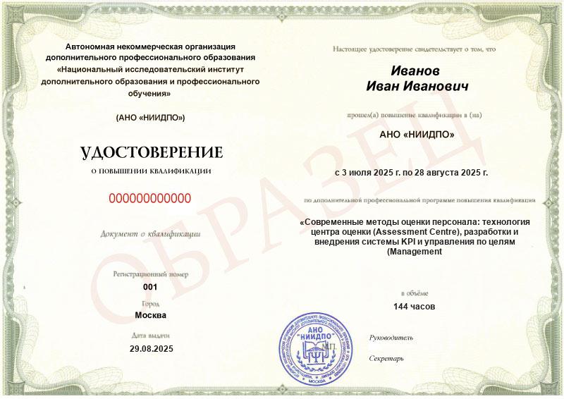 Современные методы оценки персонала: технология центра оценки (Assessment Centre), разработки и внедрения системы KPI и управления по целям (Management by Objectives) (144ч)
