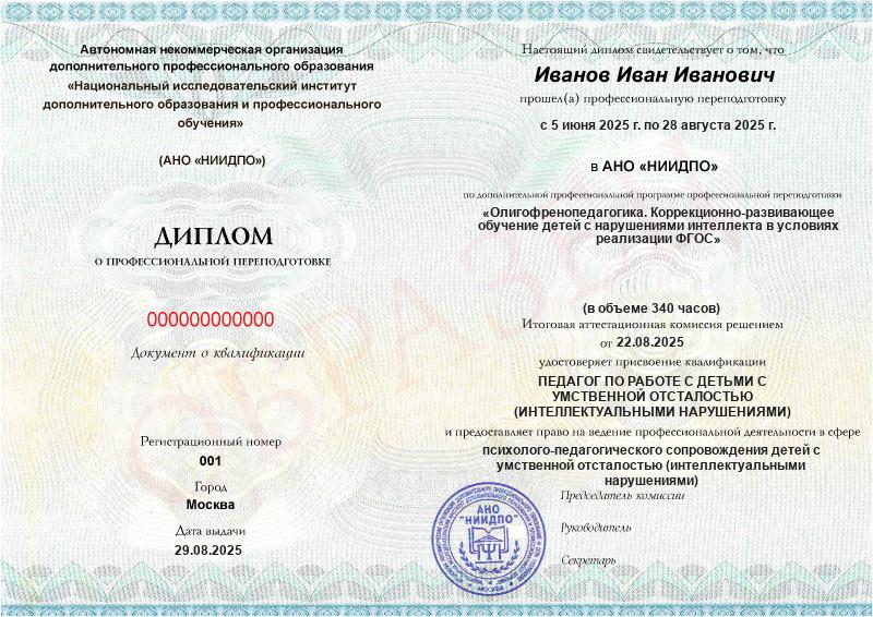 - Квалификация: Педагог по работе с детьми с умственной отсталостью (интеллектуальными нарушениями)